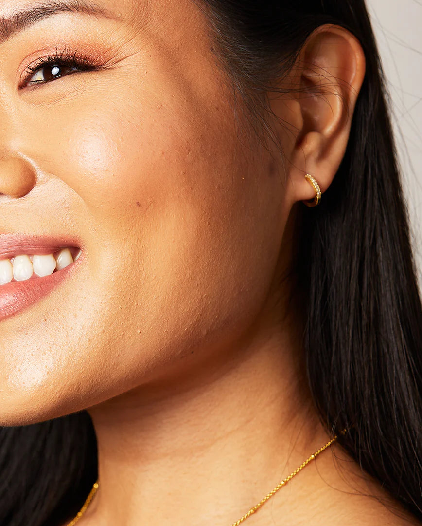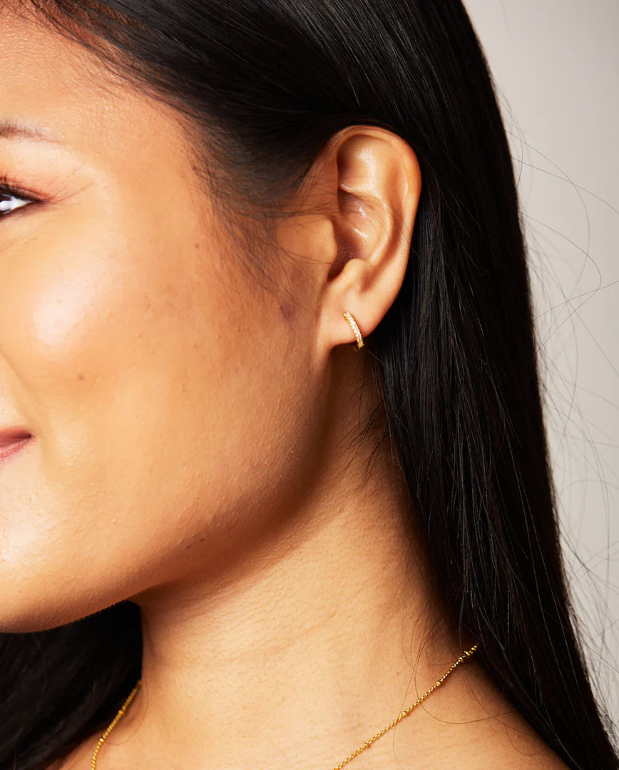 A signature balance of structure and sparkle. The Cecilia Huggies are part of our Iconic Collection—defined by sculptural clarity and subtle glamour. Hand-set with rows of brilliant crystals, these gold earrings hug the ear with just enough shine to elevate your everyday or layer seamlessly into a curated ear stack.